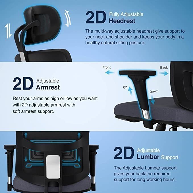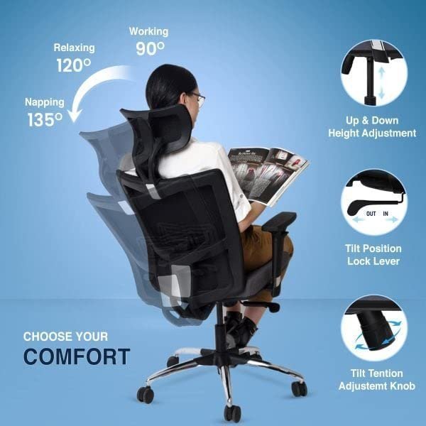 Multiple Adjustments – 2D Adjustable Headrest |Heavy Nylon Chrome Finished 2D Adjustable Arms| The Ergonomically designed S-shaped backrest can be tilted from 90 to 135degree with a 3 positions lock lever | 2D Adjustable Lumbar support can be adjusted as per the back support required.
